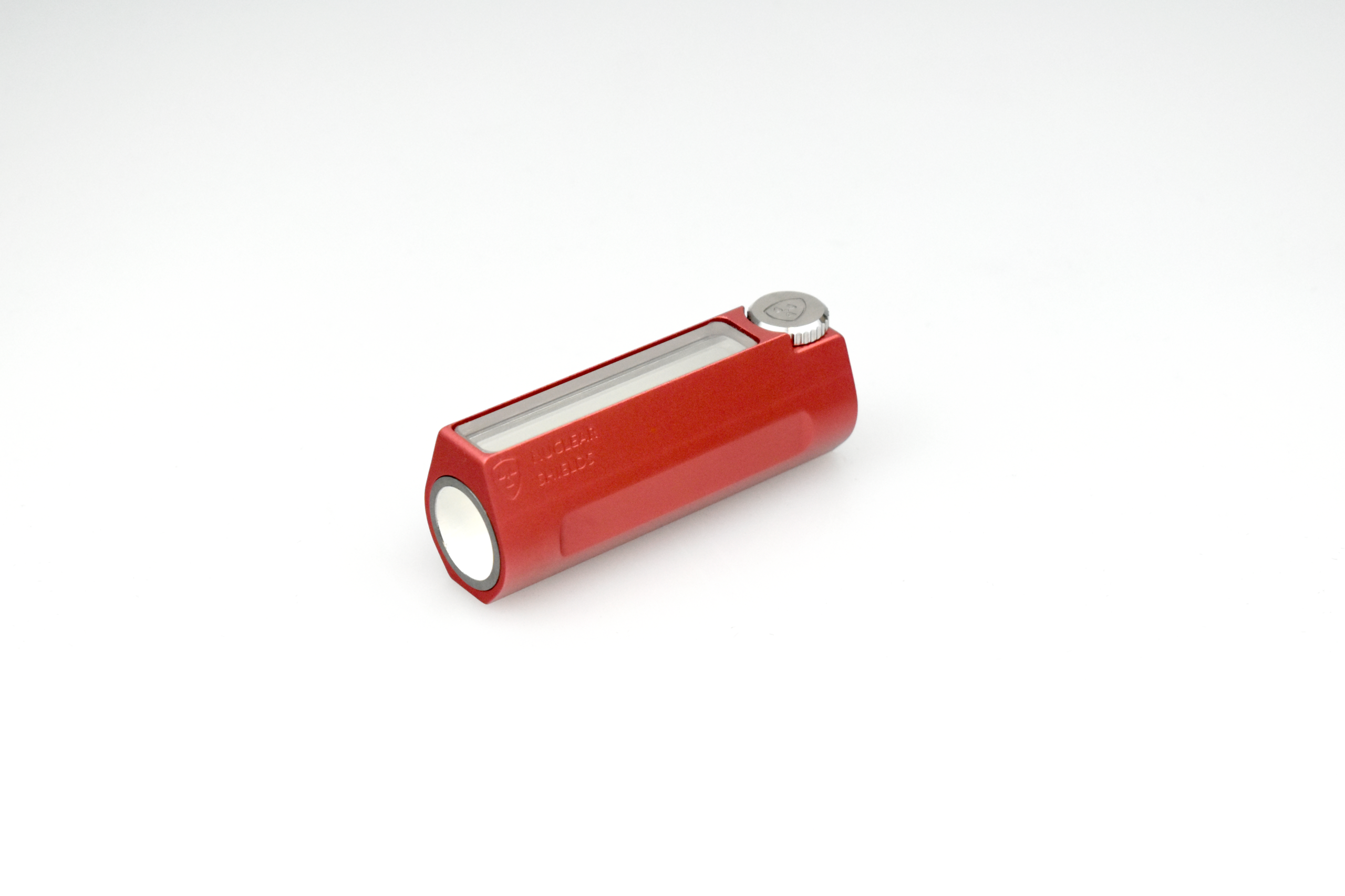 10 ml syringe shield with Big-Screw lock, 2 mm tungsten, and 10 mm lead glass. Red anodized, ergonomic, and easy to clean.