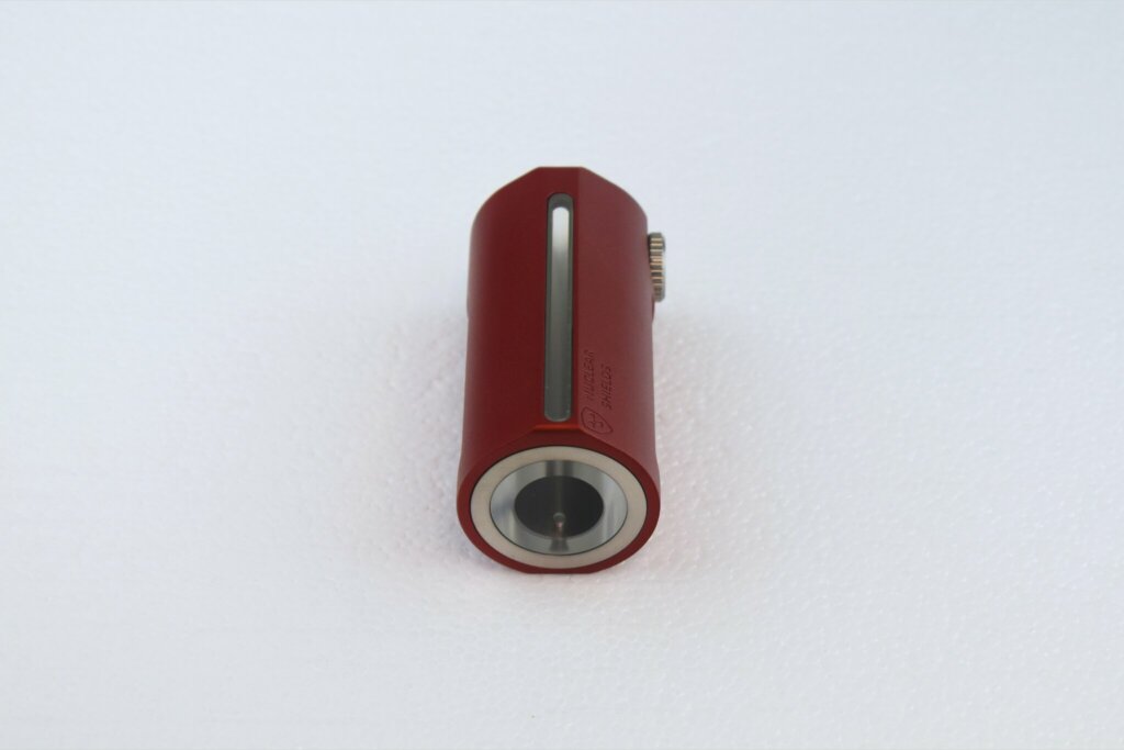 10 ml syringe shield with dual radiation protection. Tungsten-acrylic body and viewing window for safety and visibility.