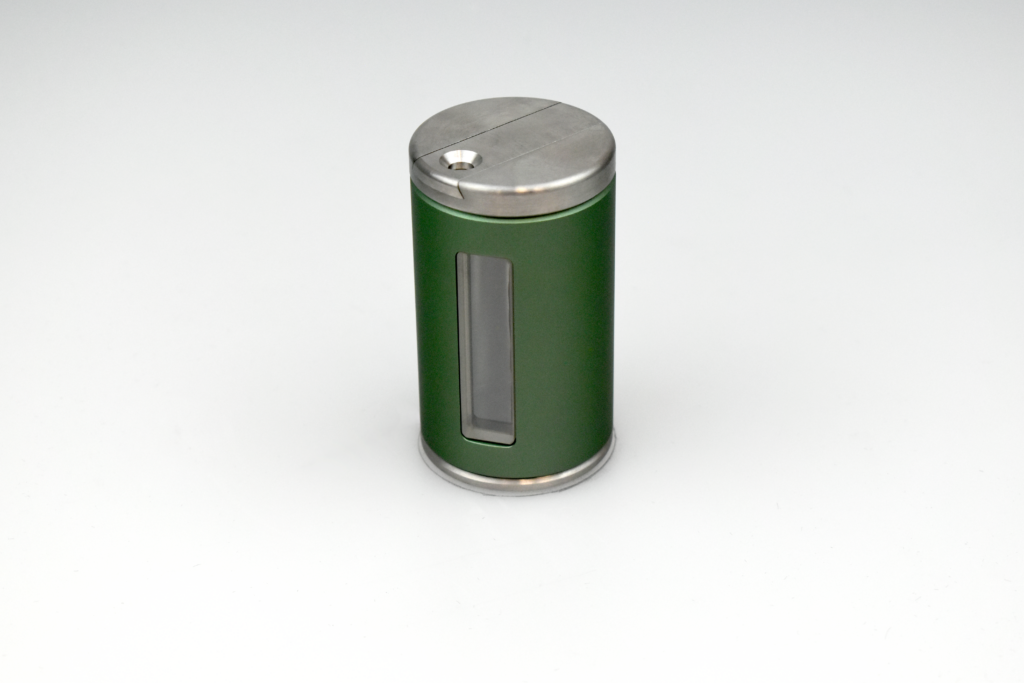 Tungsten vial shield for 15R vials with sliding cap, lead glass window, and green anodized finish. Safe, visible, and easy to use in nuclear medicine.