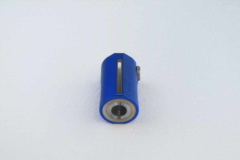 The SS23BS5-8 Dual Syringe Shield is a 5 ml radiation protection device designed for safe handling of radiopharmaceuticals that emit both beta and gamma radiation. Constructed with 4 mm tungsten and 5 mm acrylic, it offers dual shielding for optimal protection. A narrow viewing window made of 8.8 mm thick lead glass ensures clear and safe visibility during syringe handling. The integrated Big-Screw locking mechanism secures the syringe during use.