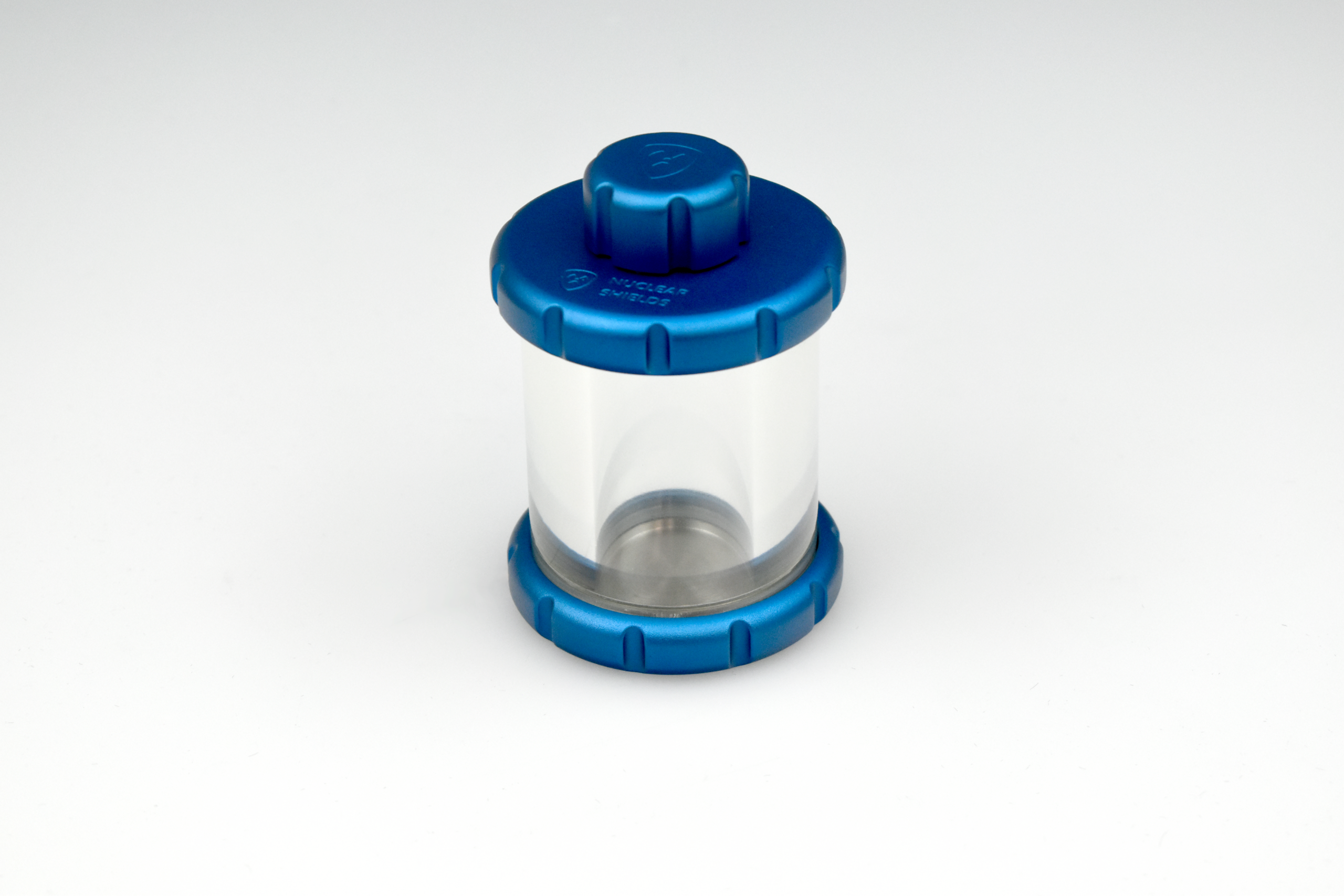 Its blue anodized aluminum screw-top provide robust support, color-coded identification, and resistance to scratches and chemical disinfectants. The screw lid allows quick access while ensuring secure closure during handling and storage.