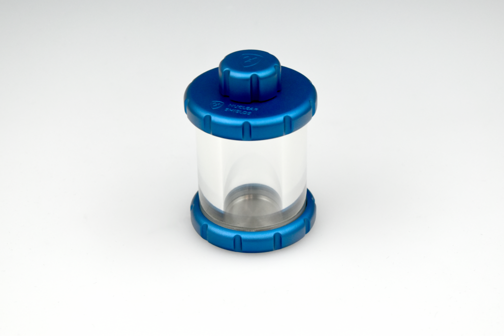 Lead glass vial shield for 30R vials with 360° visibility, tungsten inserts, and blue anodized screw lid. Ideal for daily dose handling.