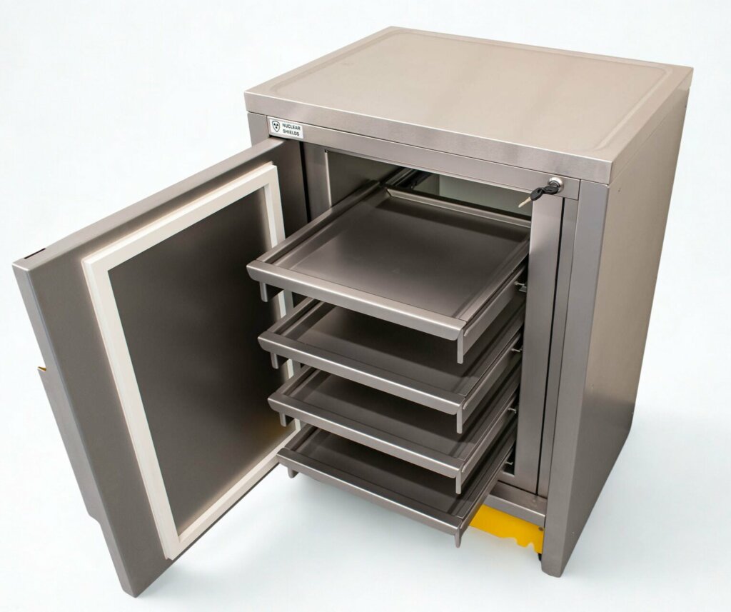 Cabinet with 4 pull-out shelves and 6 mm lead shielding. Safe and organized storage for radioactive materials in labs, hospitals, and nuclear medicine.