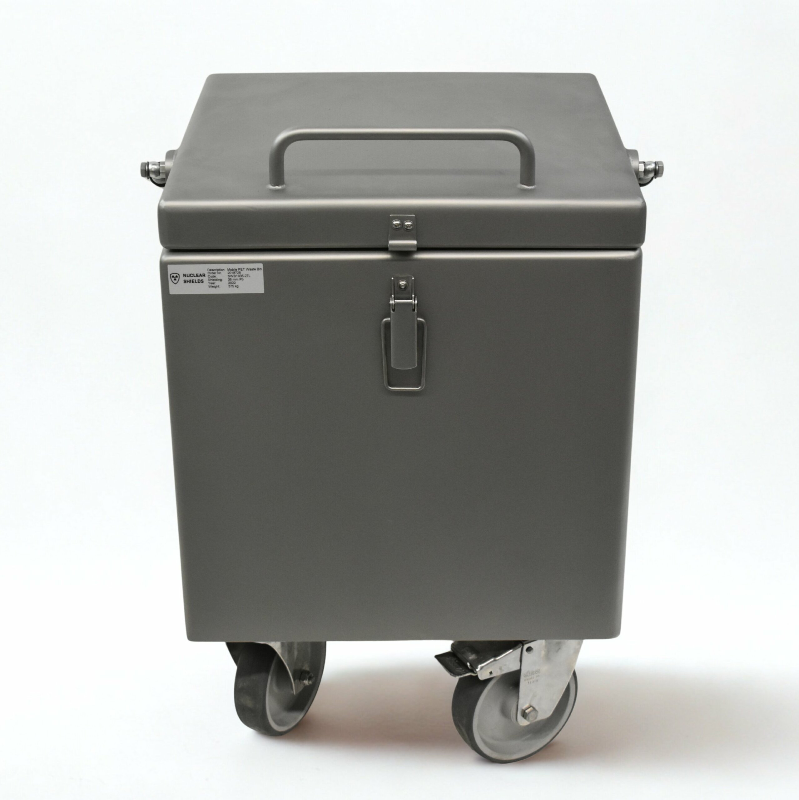 Shielded waste bin with 35 mm lead, gas spring lid, and wheels. Compact and mobile solution for safe radioactive waste disposal in high-radiation settings.