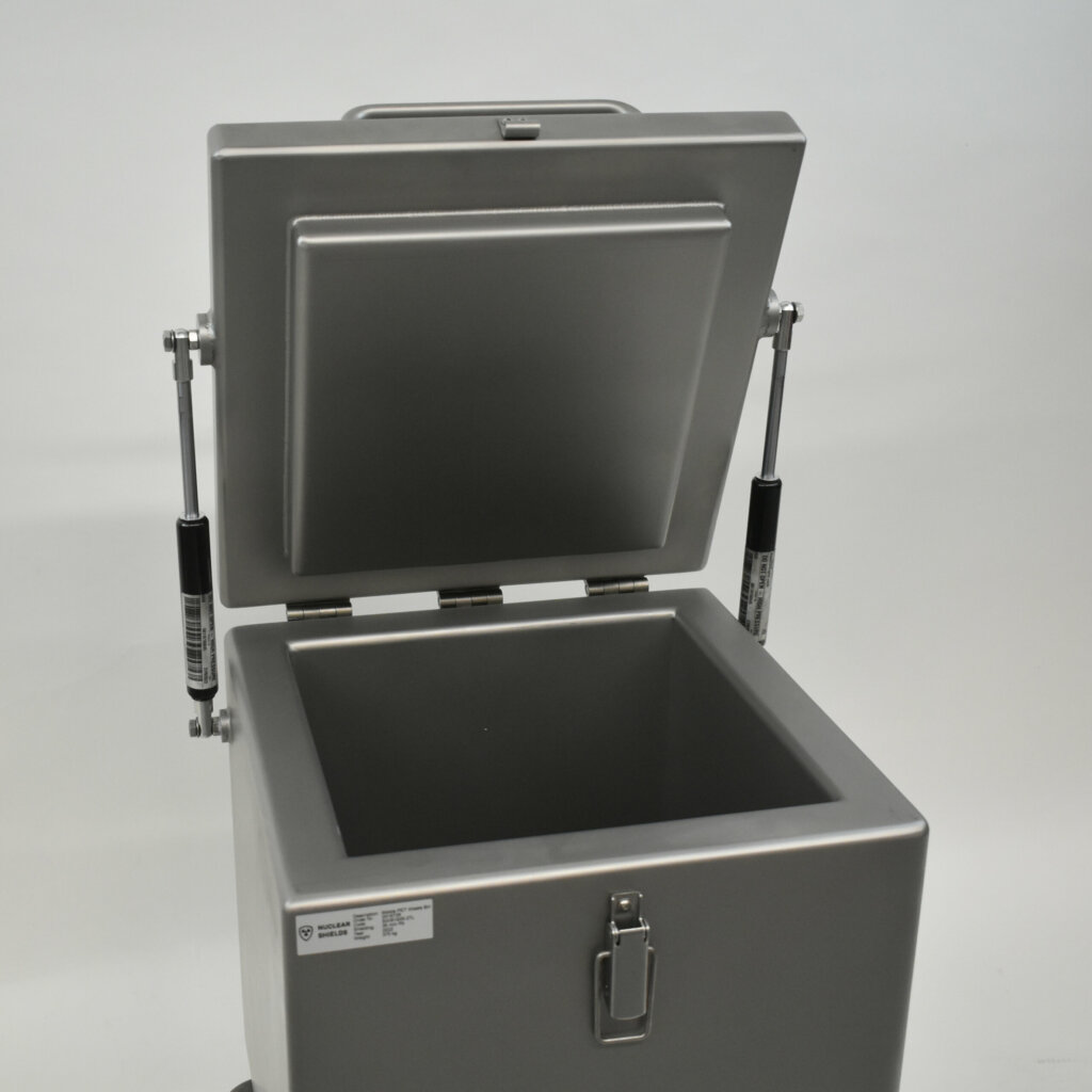 Shielded waste bin with 35 mm lead, gas spring lid, and wheels. Compact and mobile solution for safe radioactive waste disposal in high-radiation settings.