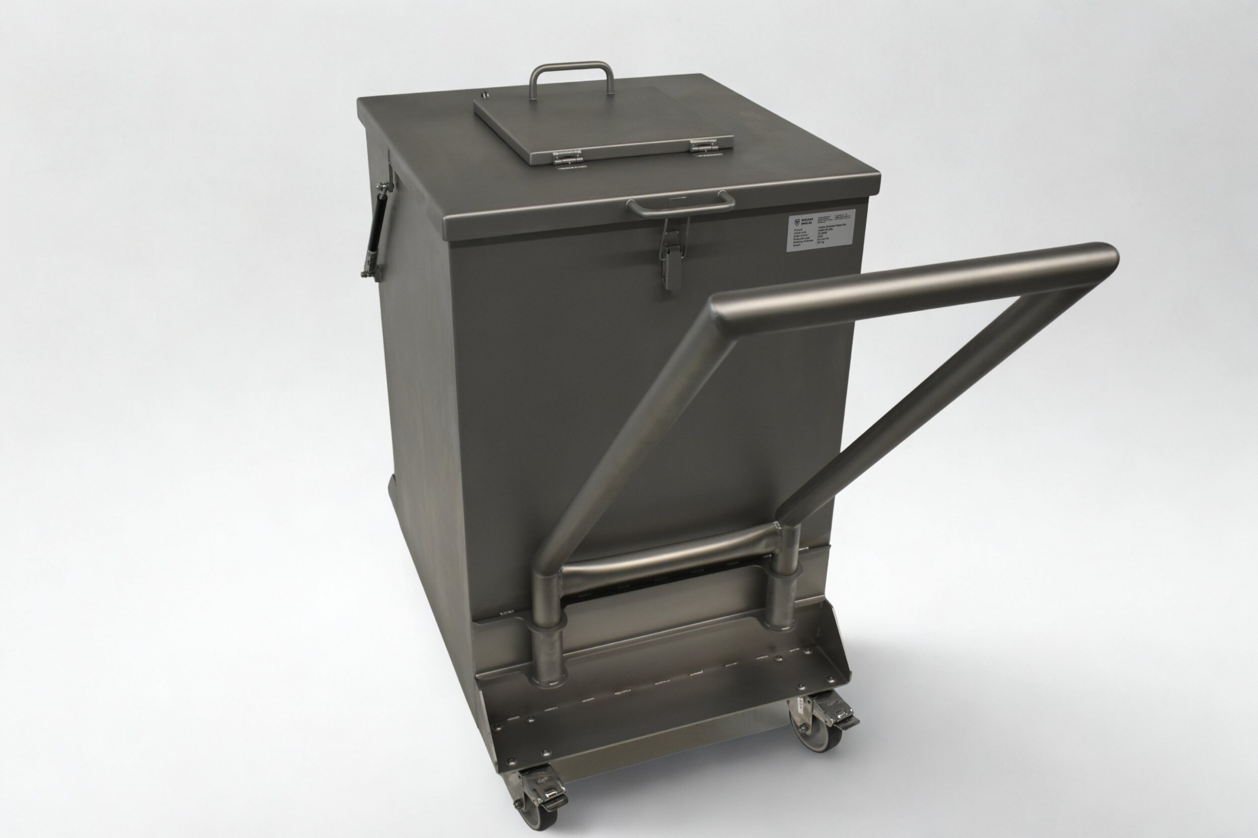 Large shielded waste bin with 6 mm lead. Mobile stainless steel unit with ergonomic handles for safe disposal of radioactive materials.