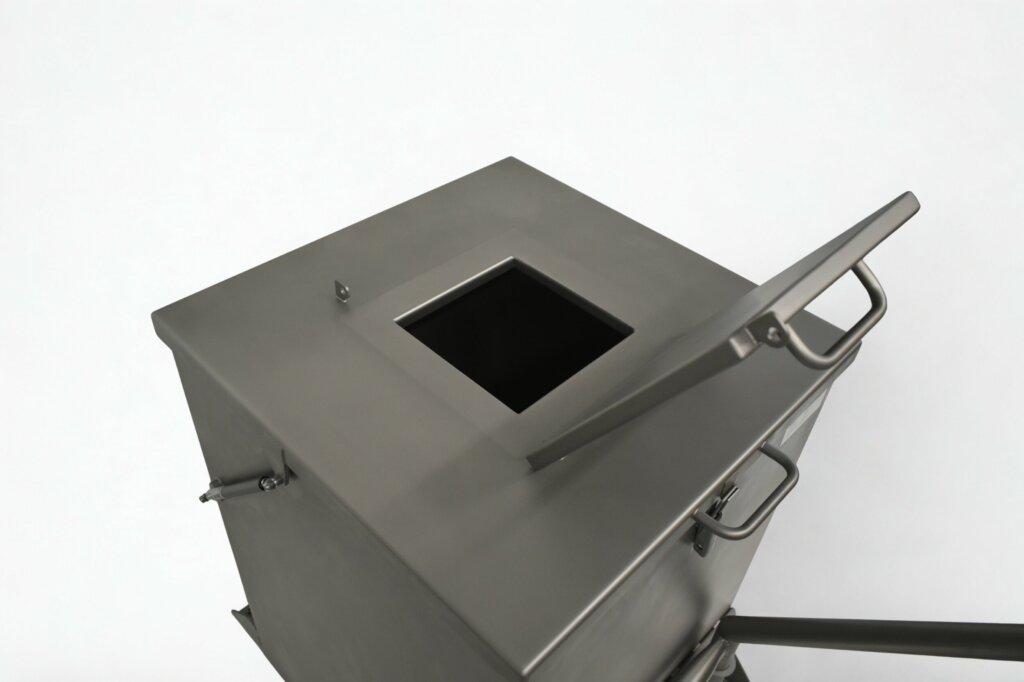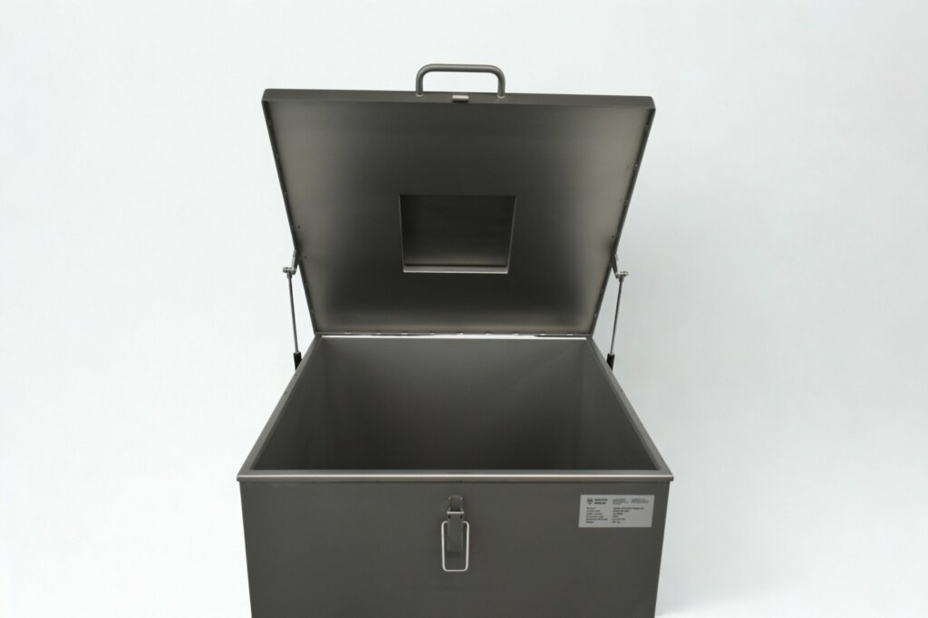 Large shielded waste bin with 6 mm lead. Mobile stainless steel unit with ergonomic handles for safe disposal of radioactive materials.