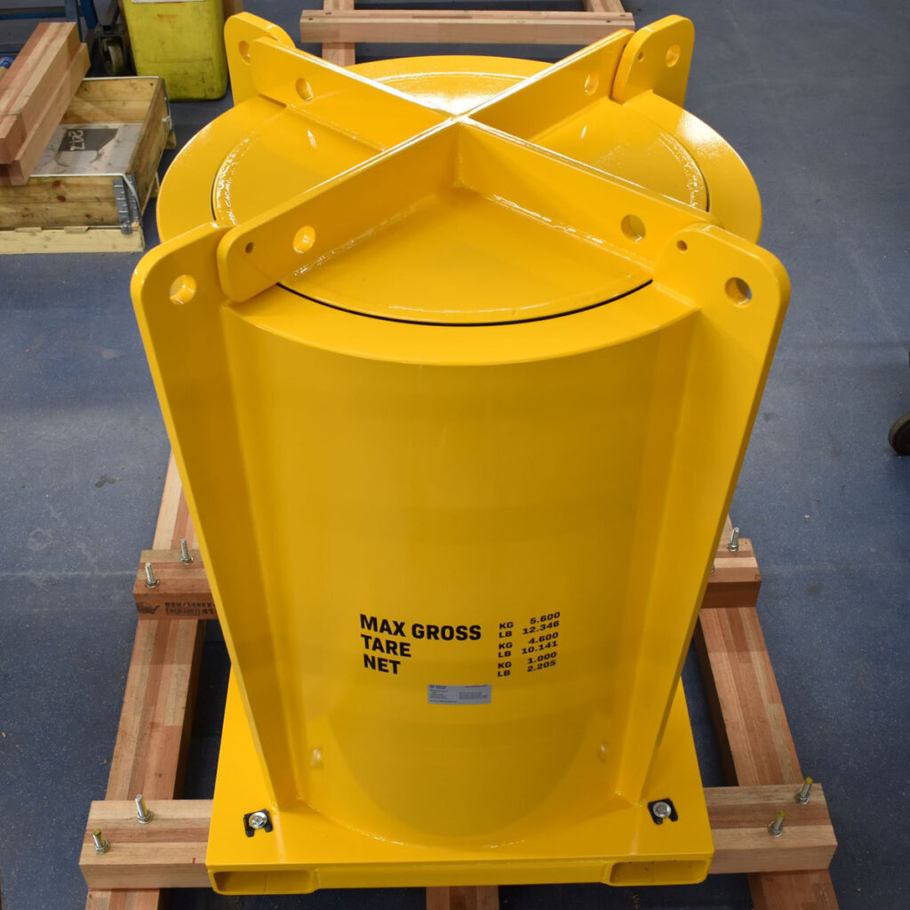 Steel positioning bars inside the cask cavity center the 200-liter drum and prevent movement during transport. This feature protects both the drum and the cask’s internal coating from damage caused by shifting loads, maintaining shielding integrity throughout the cask’s service life.