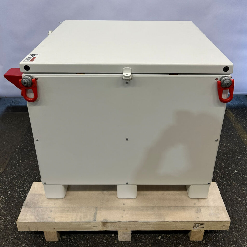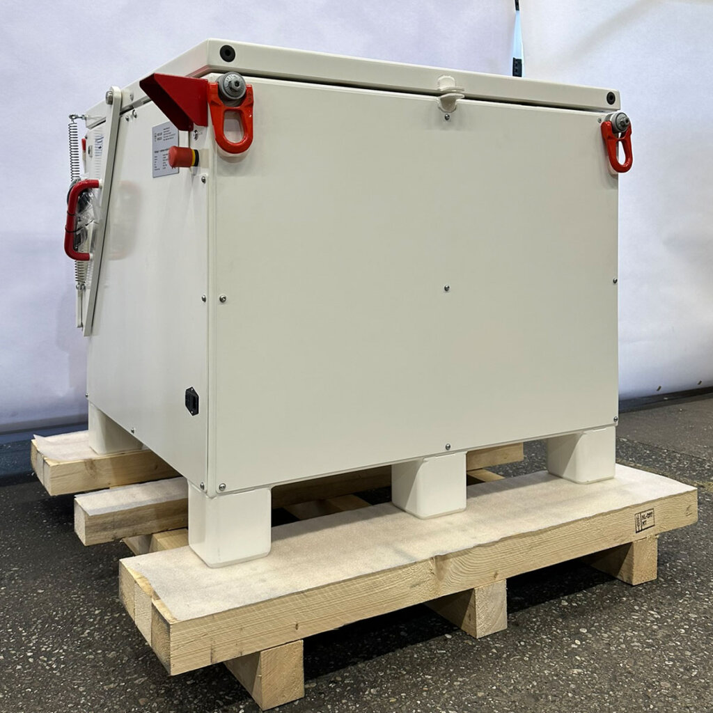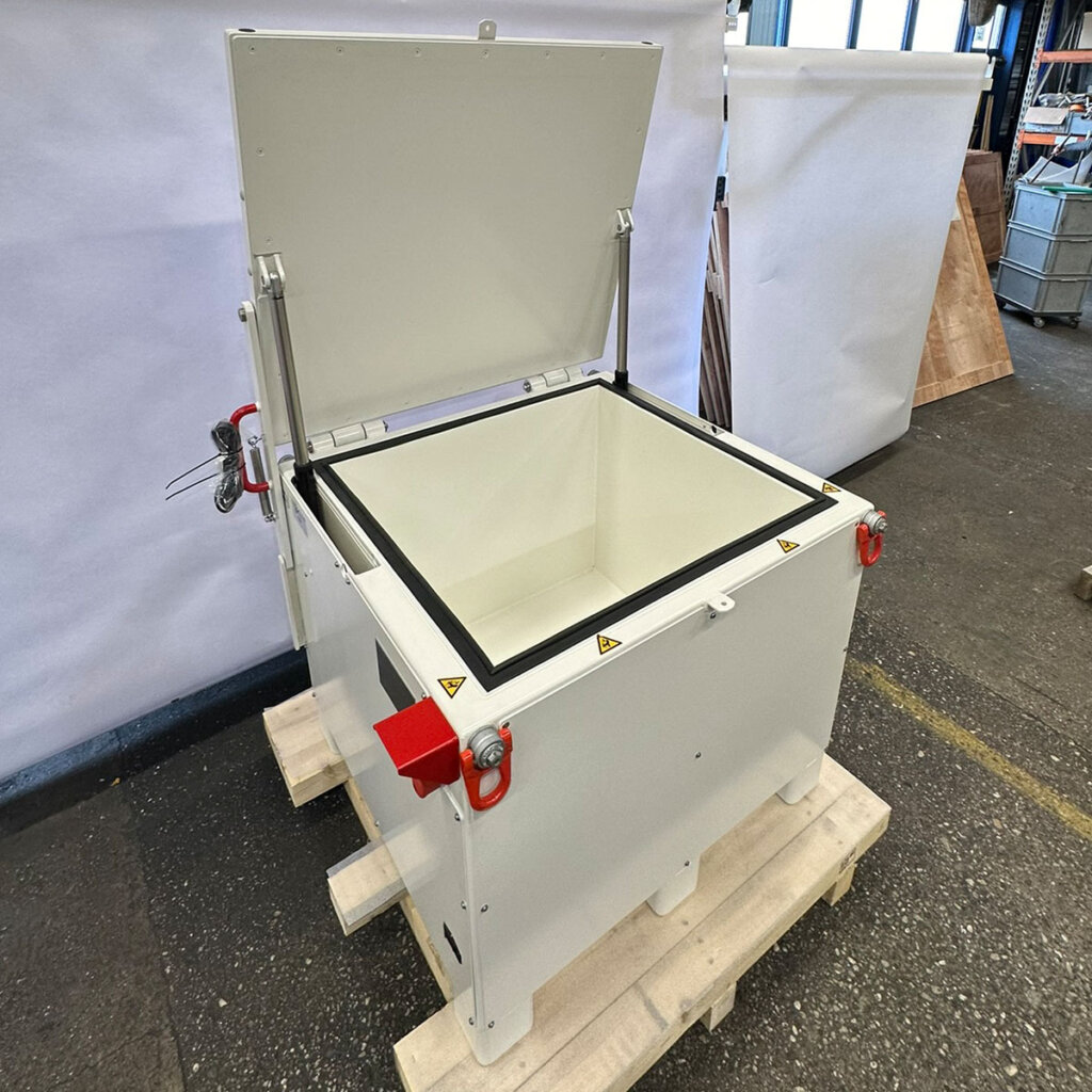 The Lead Shielded Decay Cave provides secure, shielded storage for radioactive production waste during decay periods. Featuring an electric actuator system that opens the heavy lead-lined lid at the push of a button, this decay cave enables safe and ergonomic access in high-throughput manufacturing environments. The generous interior cavity accommodates waste containers, processing residues, and contaminated materials from radiopharmaceutical production operations.