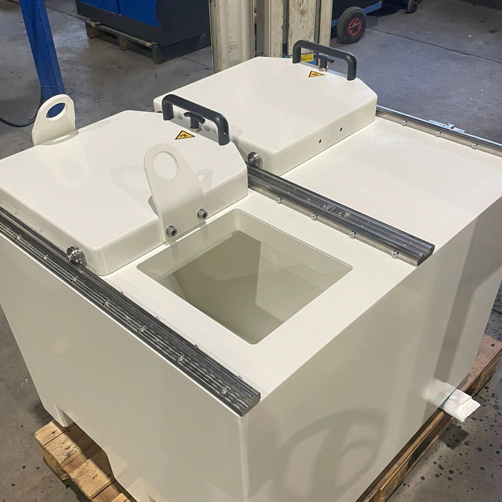 The Lead Shielded Decay Container with sliding top opening provides robust radiation protection for production waste storage during decay periods. Featuring 50 mm of lead shielding on all sides and a horizontally sliding lid mechanism, this container delivers heavy shielding with practical access for radioisotope manufacturing operations.